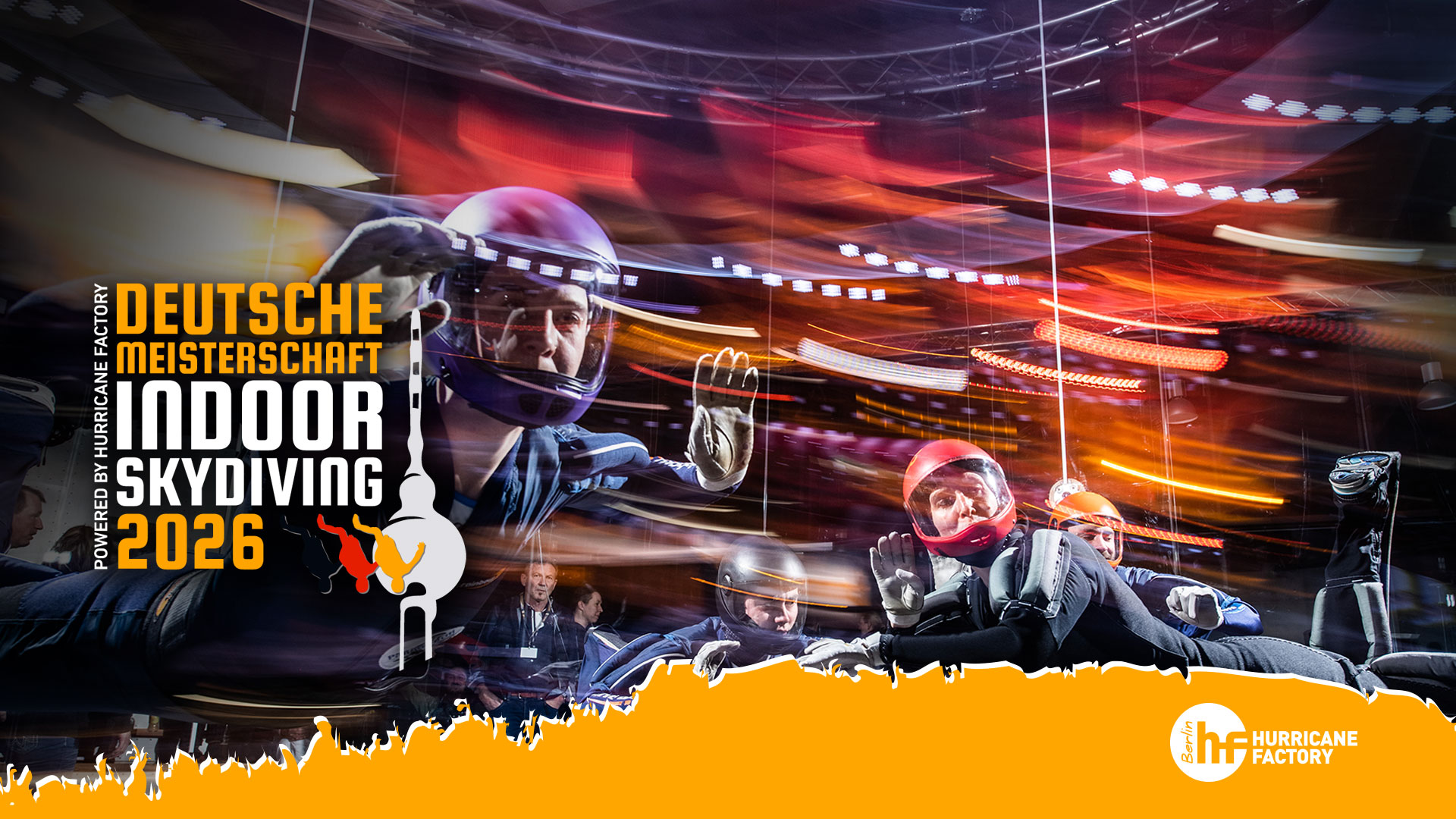 Vom 12. bis 15. März 2026 findet die 7. Deutsche Meisterschaft im Indoor Skydiving statt, ausgerichtet durch die HURRICANE FACTORY Berlin im Auftrag der Bundeskommission Fallschirmsport (BKF) von DFV und DAeC.